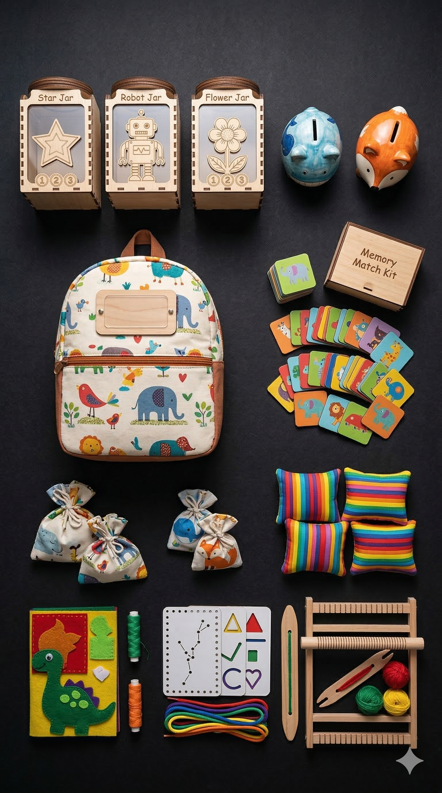 Personalized reward jars, piggy banks, and educational kits for schools and birthdays.